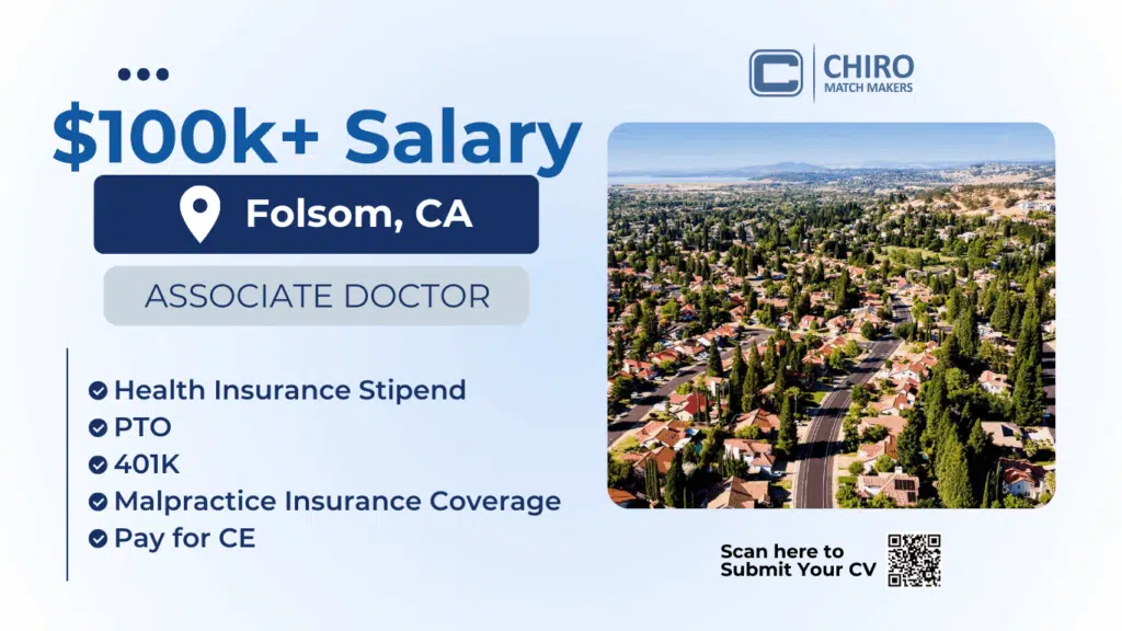 A respected and well-established chiropractic clinic in Folsom, CA is seeking an Associate Chiropractor to join its growing, multi-location team. This full-time role offers a competitive base salary of $100,000–$105,000 along with comprehensive benefits, including a health insurance stipend, PTO, malpractice coverage, CE reimbursement, and a 401K.